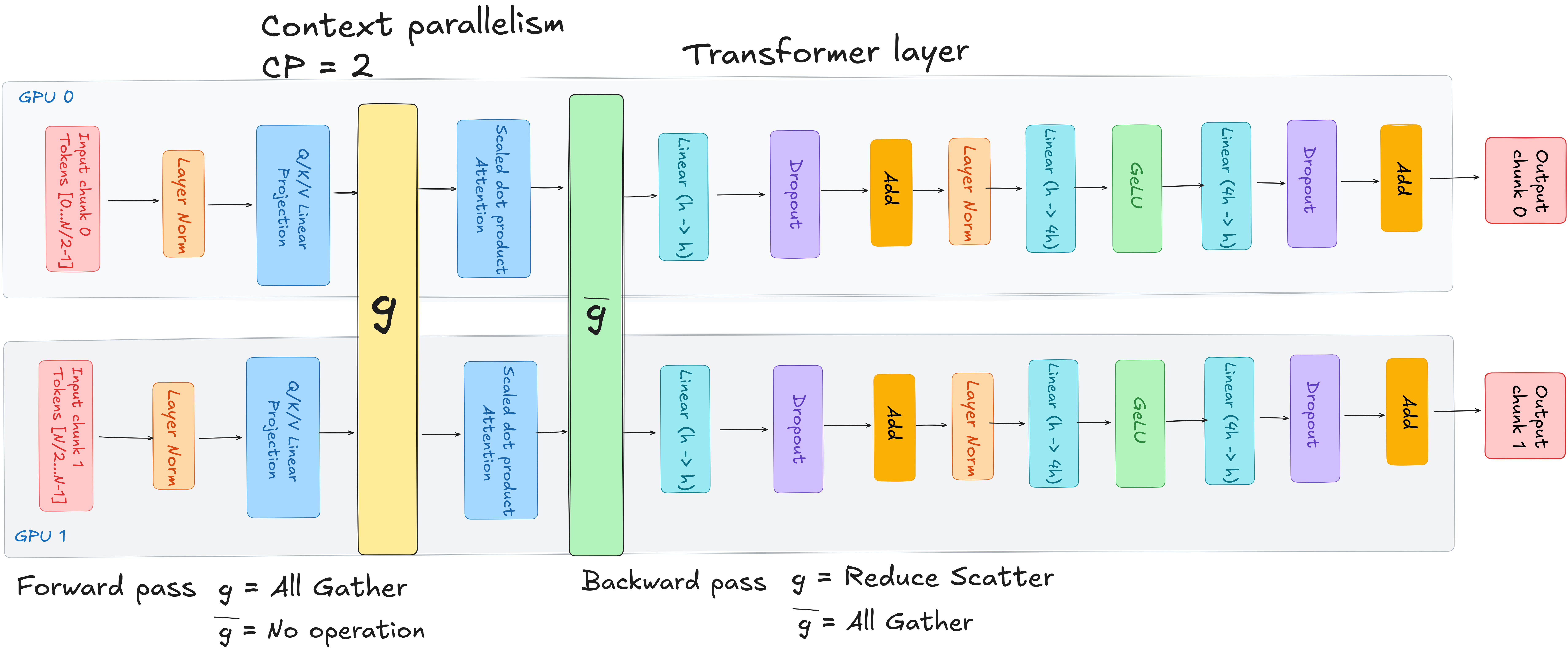 In the figure above, for a context parallelism of degree 2, only the input is split across 2 devices. GPU 0 processes the first half of the sequence, while GPU 1 processes the second half. The attention block requires all tokens to compute attention scores. Therefore, we need to communicate the key and value tensors across devices before computing attention. After the attention block, the MLP and LayerNorm can be computed independently on each device without further communication. To conserve the memory, we can discard the communicated key and value tensors after the attention block. The final output of the transformer block is then a concatenation of the outputs from both devices.