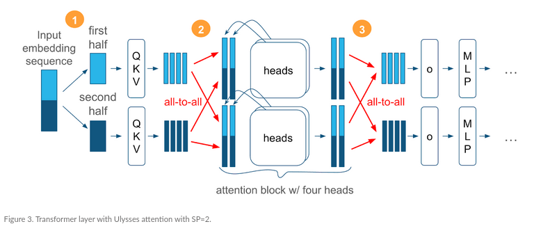 In the naive implementation of CP, each GPU holds all attention heads for its local slice of the sequence. The DeepSpeed-Ulysses approach addresses this by further sharding the attention heads across devices. Instead of every GPU storing all heads for its token chunk, each GPU stores only a subset of heads. This reduces KV-matrix size, Q/K/V projection size, and overall memory footprint unlocking larger models and longer context lengths training. This approach supports any attention mechanism such as self-attention, cross-attention.