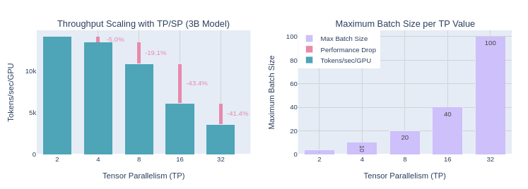 The attention KV tensors starts dominating for large sequence sizes, TP + SP replicates this matrix on every device. The combination of TP + SP works well within a single node using NVLink communication. However when scaling across multiple nodes, the communication overhead can become a bottleneck. The following diagram shows a significant performance drop going from TP=8 to TP=16.