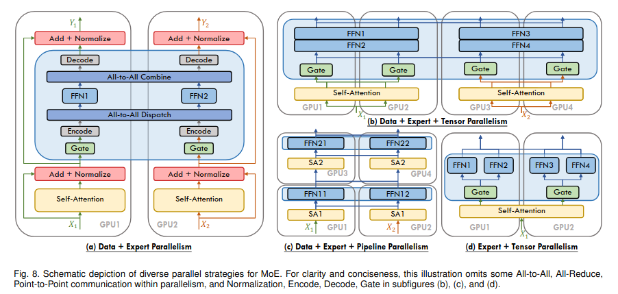 Similarly, combining EP with tensor parallelism (TP) and data parallelism (DP) allows scaling to very large models where dense layers are split across GPUs, experts are distributed across another set of GPUs, and the entire model is replicated across data parallel groups. This multi-dimensional strategy makes it possible to train extremely large MoE models that would not fit or compute efficiently under a single form of parallelism.