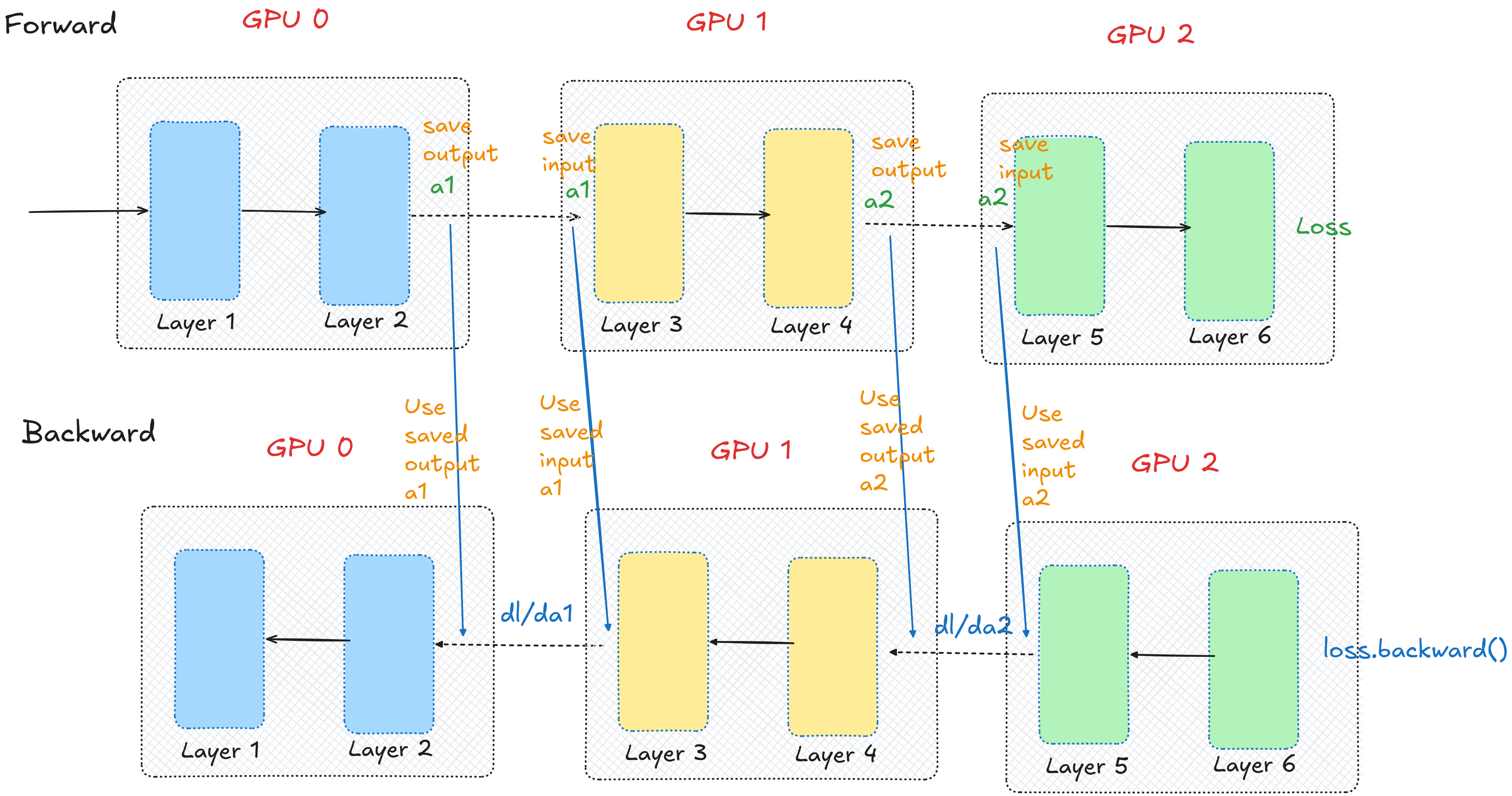 Here is what the flow for forward and backward pass looks like for splitting 6 layers across 3 GPUs. It saves activations across the pipeline stages which are reused for calculating backward gradients.
