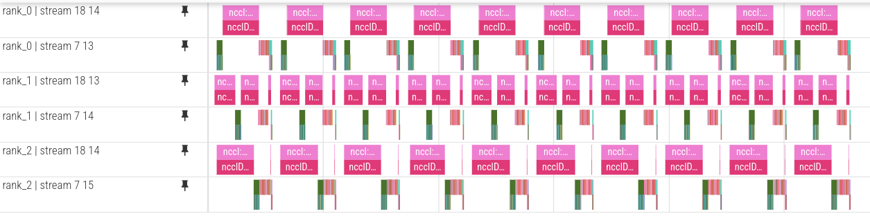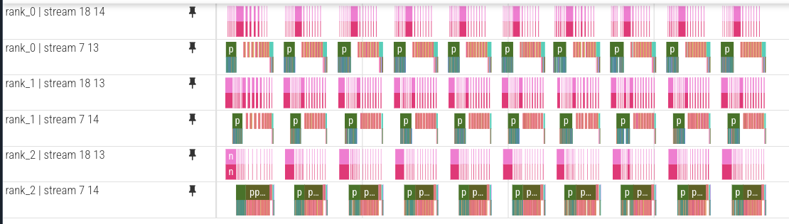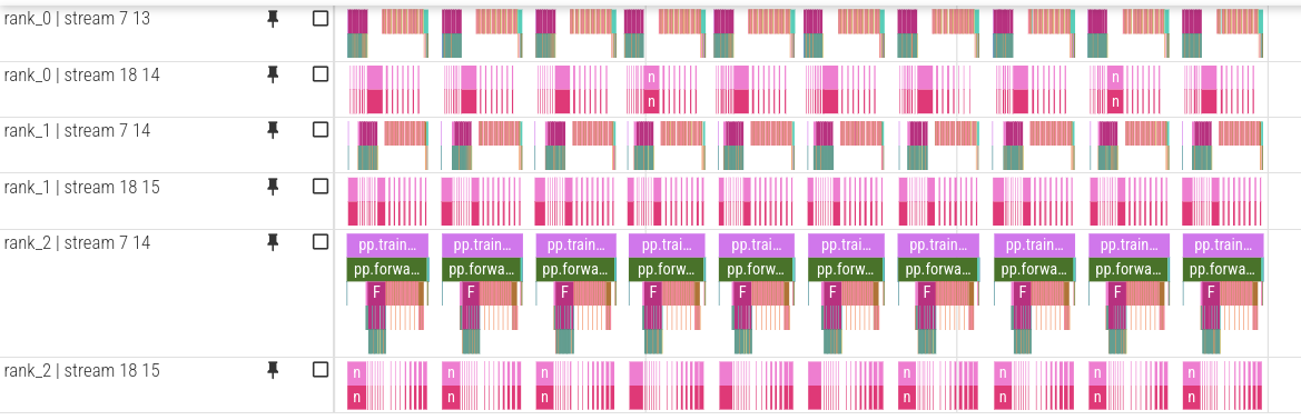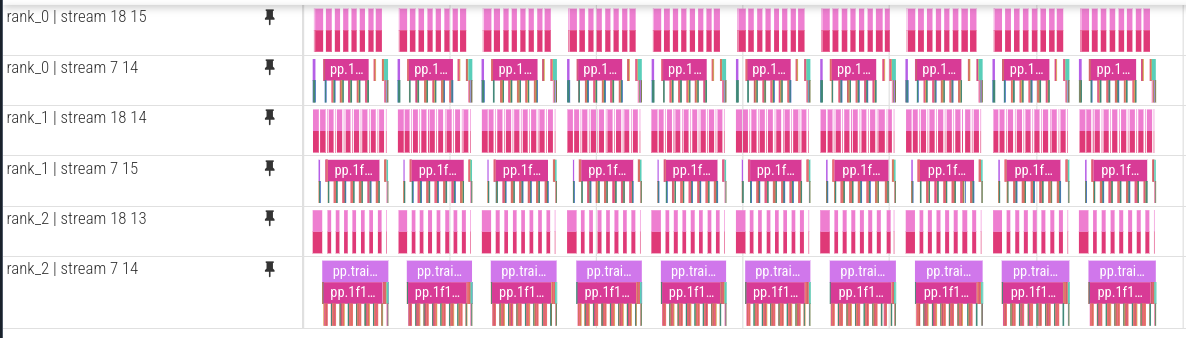 The pipeline bubble is also smaller than in the naive schedule. Compared to GPipe, the main visible difference is not just utilization, but the much more fine-grained alternation of forward and backward work in the trace.