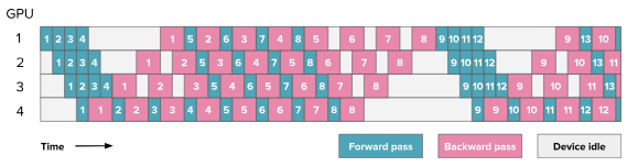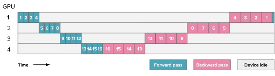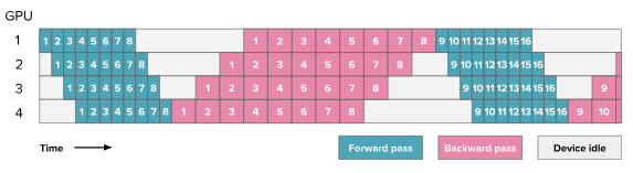 - Backward pass: The gradients computed during backward pass flow in the opposite direction, from the last GPU to the first. Each GPU must wait for the gradient from the next stage before starting its backward computation.