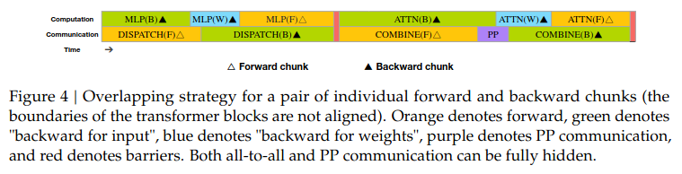 - DualPipe: full overlap with bidirectional scheduling.