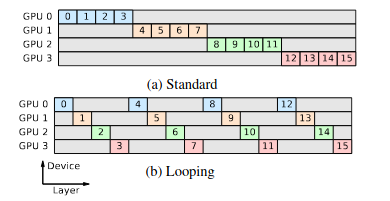 To further reduce the bubble size, instead of linear splitting layers across GPUs for the model, the layers of the model are interleaved across devices to form a ring, connecting first and last GPU creating a loop.