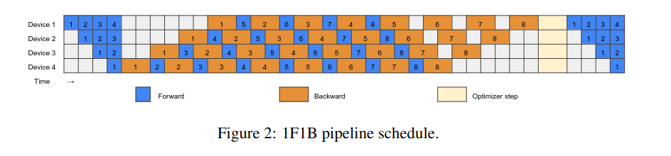 - 1F1B: reduced activation memory with alternating passes.
