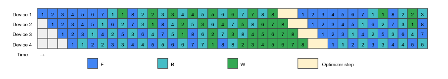 The figure above shows 1F1B scheduling where there are lot of idle times (white squares). The figure below shows Zero Bubble schedule where nearly all the idle time is eliminated. There’s a complexity here in how these schedules are designed heuristically and synchronizing the gradients for the optimizer step.
