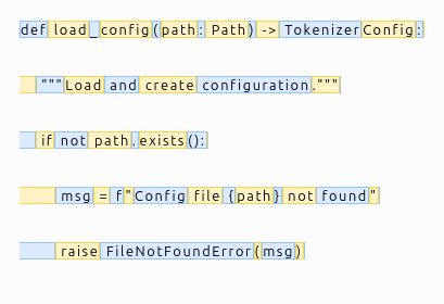 The code repository also contains helper function to visualize the tokenizer output for the code. Here’s an example output for a Python code: